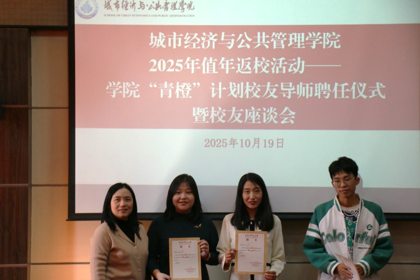 报到结束后,学院“青橙”计划校友导师聘任仪式暨校友座谈会在博纳楼五层第六会议室举行。学院党委书记刘智勇、党委副书记张莹、副院长邬晓霞、土地资源管理系教授赵秀池及学院辅导员出席会议,与返校校友们共话发展、共叙情谊。