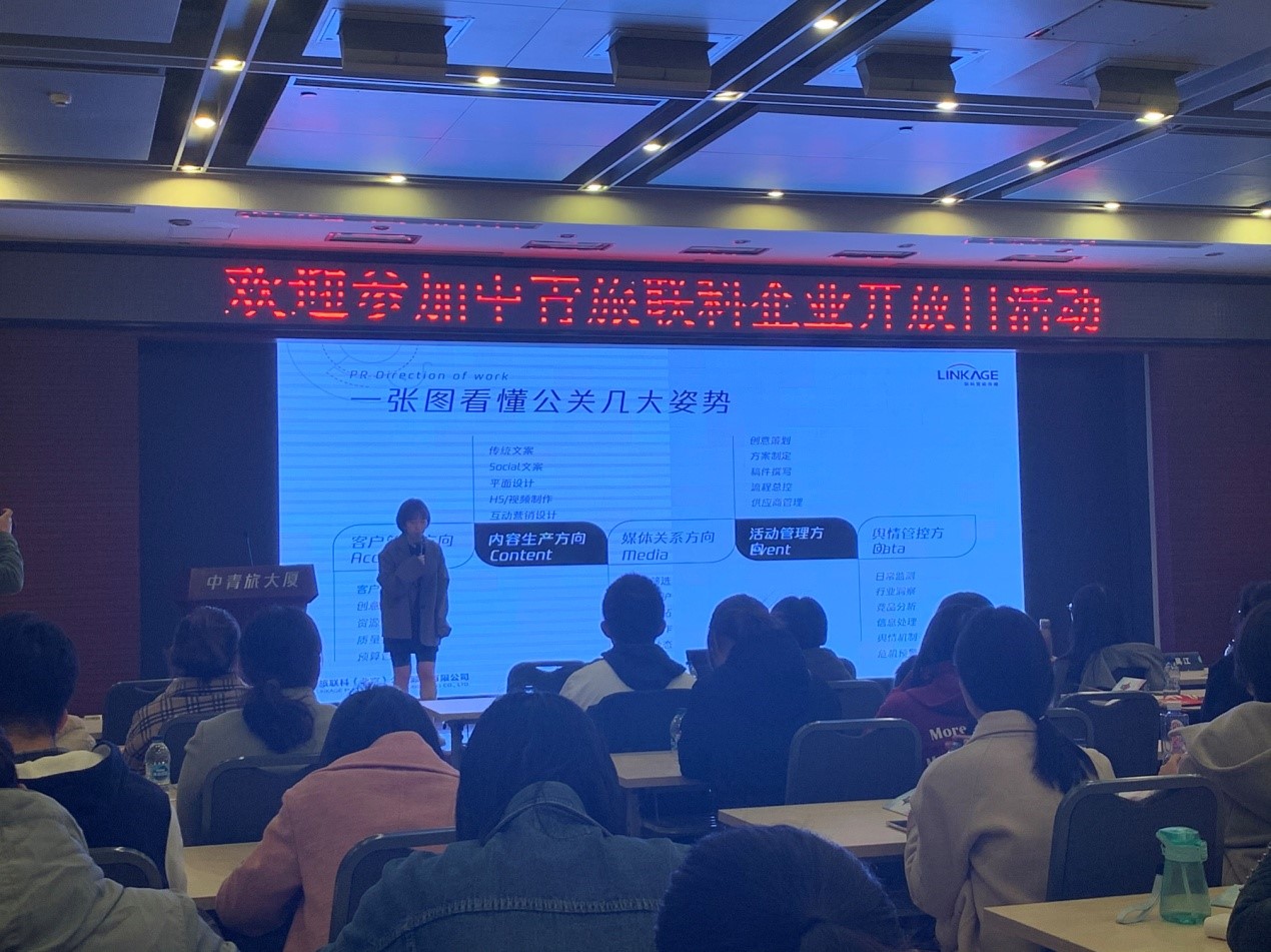 业务介绍与案例分享板块由公关部门的曲经理主持。作为90后,曲经理的讲解通俗易懂,使得同学们收获颇丰。为了方便同学们的理解以及了解公关部门具体的工作内容和相关能力要求,她介绍了公关、品牌、营销和广告四者之间的异同。用曲经理的话来说公关活动就是向其他人传达“我真的很好”的一个方式和过程。