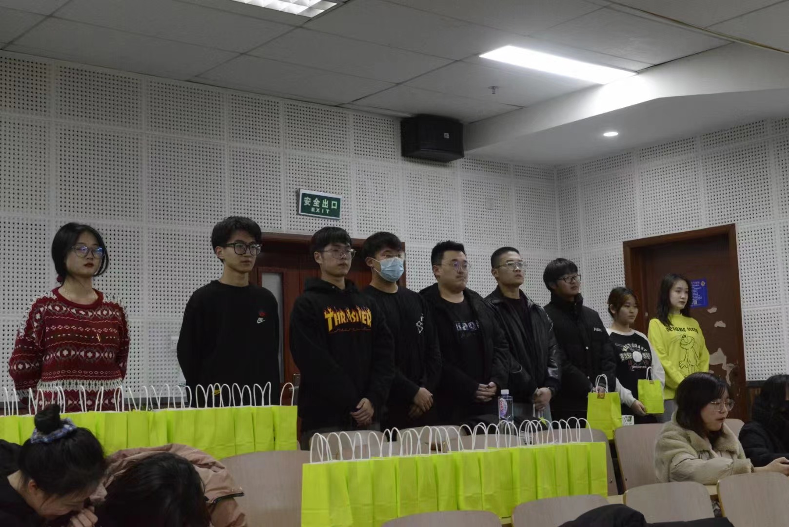 在一段时间认真的排练之后,学生会各部门为同学们发放了由外联部精心准备的慰问品,犒劳大家的辛苦付出。里面有文艺部联合其他部门成员,为参加大合唱的每个同学准备的专属的小卡片及定制食品。收到自己专属礼物,同学们脸上露出了满足的笑容。