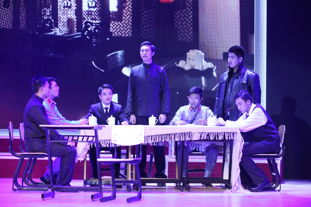最先进行的是主演的排练,由李靳楠饰演张国焘,刘骥饰演周恩来,才仁巴丁饰演恽代英,庞克锋饰演谭平山,周天时饰演刘伯承,郑仲煜饰演贺龙,称颂孟秋和肖秋宁饰演警卫员,学院朱荩臣老师饰演李立三。刚开始排练的一个星期,每天所有主演都会进行排练,在排练过程中,对于三位部长提出的改进建议,每个同学都会认真听取。在整体工作方向上,文艺部部长王瑞霖和副部长吴桐进行队形及动作设计,叶咏婕做动作指导,初步排练了群演同学们的动作,由文艺部副部长戴颜蔓排练合唱部分。所有内容排练完毕后,由表演老师朱老师和合唱老师于老师对排练内容进行指导改进。因为场地有限的原因,在寒冷的夜晚,所有人在经贸广场进行露天训练,每个人都认真对待一遍遍的走场。比赛前两天每天晚上都进行联排,以加强大家动作连贯性。赛前两个小时,所有同学穿着单薄的演出服装,在寒风中继续排练,没有一个人因为天气冷而退缩懈怠,因为大家想完成一场完美的演出。经过每个人的不懈努力,最终所有的动作都完成的很好。