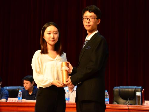 接着,是在校生代表冯子璇同学的发言。她首先介绍了城市学院的基本情况、育人价值观和城院精神。希望新生们在大学时树立目标,点燃对学习科研和生活的热情,保持身心健康,认真思考未来。言毕,她代表全体在校生向新生代表赠送了一份由全院师生精心挑选的,有助于新生成长的书单,象征着城院学子学识的薪火相传,寄托着全体在校生对于新同学的美好希冀。