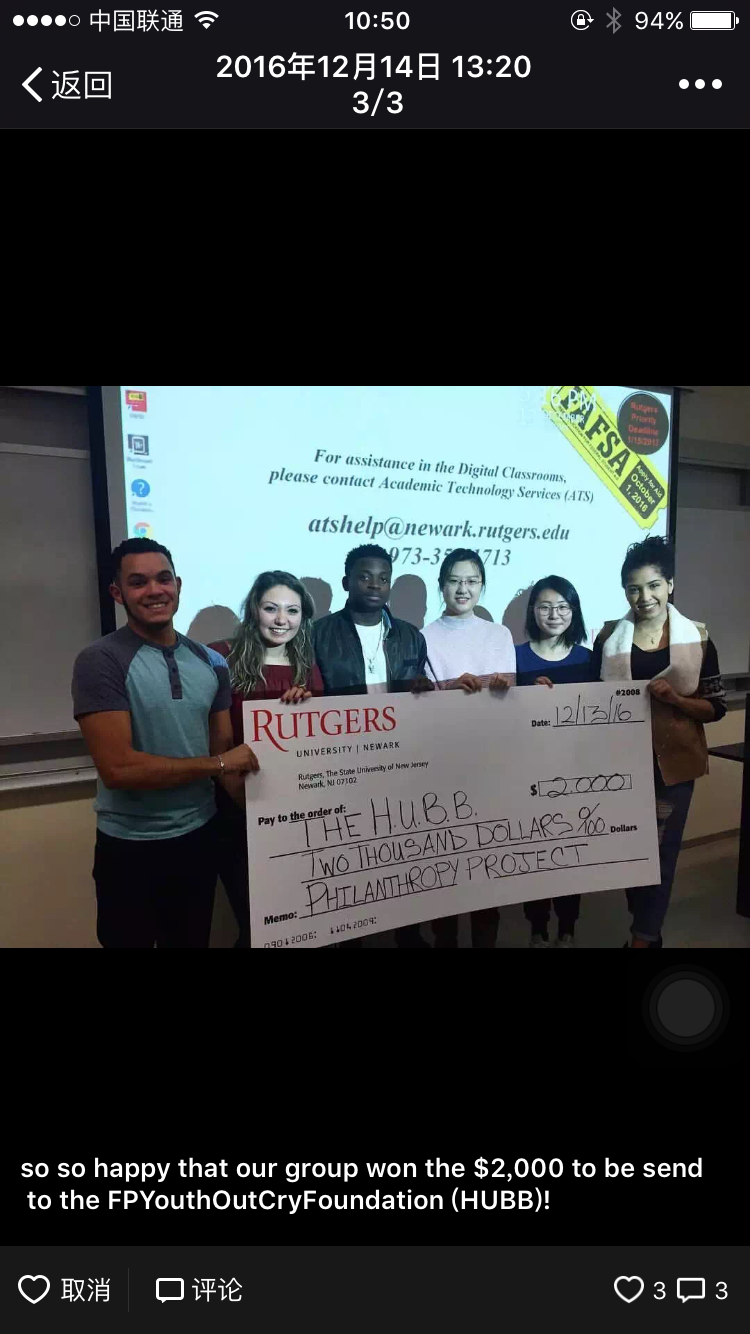 除了课堂学习,同学们也积极走出课堂,践行“觉知此事须躬行”的实践理念。在课堂之余,同学们参与了形形色色的志愿活动。甚至有同学注册了Jersey Cares的志愿者组织, 坚持每周都去做志愿服务。在丰富自身课余生活、体验美国志愿者活动的同时,也为他人提供切实的帮助服务,不但实现了自身价值,也培养了自己的公共服务意识。