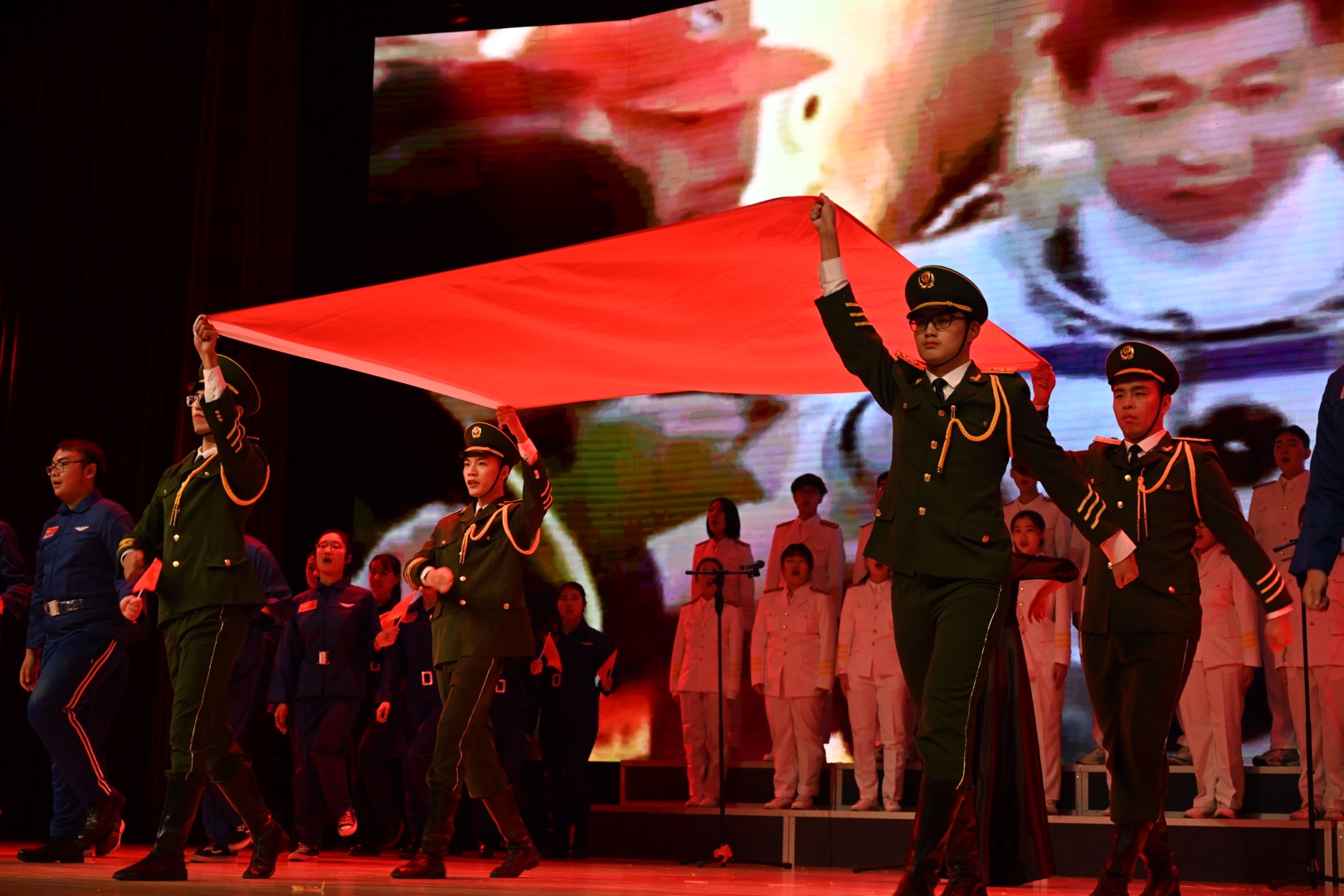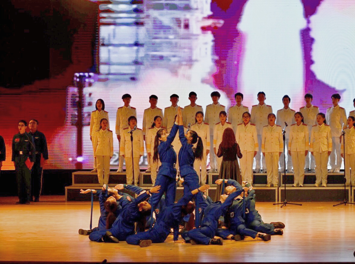 灯光亮起,同学们迈着整齐的步伐进入了舞台,带我们回到当年载人航天任务的训练场上。看到扮演杨利伟的张灏忱那英姿飒爽的姿态,令人不由得拍手称绝。扮演妻子的杜逸所表现出的那舍己为国的大义之情也让人为之肃然起敬。当《祖国不会忘记》的音乐响起,慷慨激昂的歌声迸发而出。舞蹈演员们的动作整齐划一,将航天员们的训练动作用舞蹈展现出来,演绎出力量与柔美的完美结合。饰演报童的马瑙同学用激情的呼喊把演出的情绪带到最高潮。随着倒数计时结束,一张张熟悉而又陌生的、默默无闻的把青春奉献在载人航天一线的航天人的面孔浮现在我们的眼前。