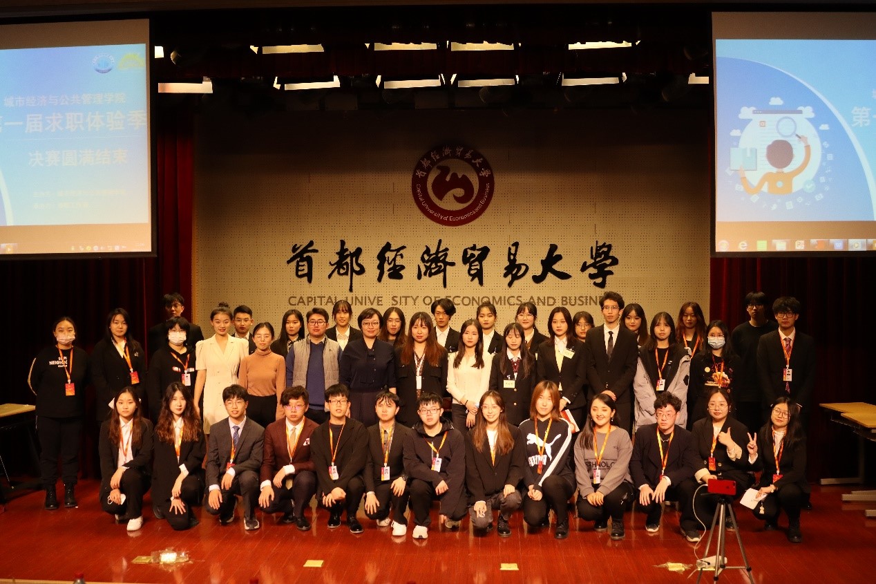 袁欣雨和张灏忱两位同学担任决赛主持。原MaxMara中华区人力资源经理高慧、北京华联商厦股份有限公司总部人力资源经理杨懿、就业指导中心签约服务负责老师田霖鹏和城市学院专职辅导员冯雨南担任决赛评委。城市学院兼职辅导员金丽娜也出席了此次决赛。经过简历筛选和线上笔试,共有十位选手入围。