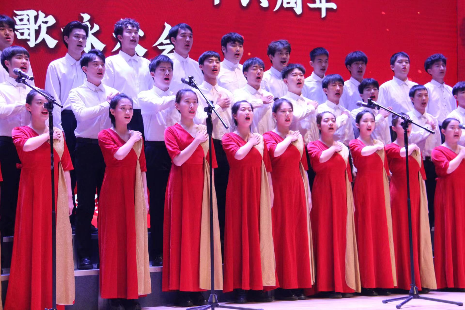 “薪火相传·强国有我”序幕拉开,主持人话音渐弱,城院合唱团的五十九名演员伴随着柔美的钢琴声和朗诵声,登场亮相。五十多双眼睛汇聚一处,五十多个音符在此刻交融,同学们跟随着指挥王新博手势的起落,采取清唱的形式,用最清澈、纯美、质朴、不含任何杂质的天籁之音将老百姓对共产党的最朴实的情感娓娓道来。轮唱部分,四个声部的歌声此起彼伏,歌颂着共产党对老百姓的牵挂与深情。“老百姓是山,老百姓是海,老百姓是共产党生命的源泉!”此句将整首歌推向高潮,习近平总书记在“庆祝建党一百周年大会”上的讲话在大屏幕上重现,“江山就是人民、人民就是江山,打江山、守江山,守的是人民的心。”语毕,同学们难掩激动的心情,齐喊口号:“请党放心,强国有我!”灯光减弱,全体演员谢幕退场。 台下观众席的城院师生也一同高喊口号“城市青年,牢记使命!”刹那间声音此起彼伏,星星之火可以燎原,城市青年们必将肩负起时代赋予的重任,为中华民族的伟大复兴贡献自己的青年力量!