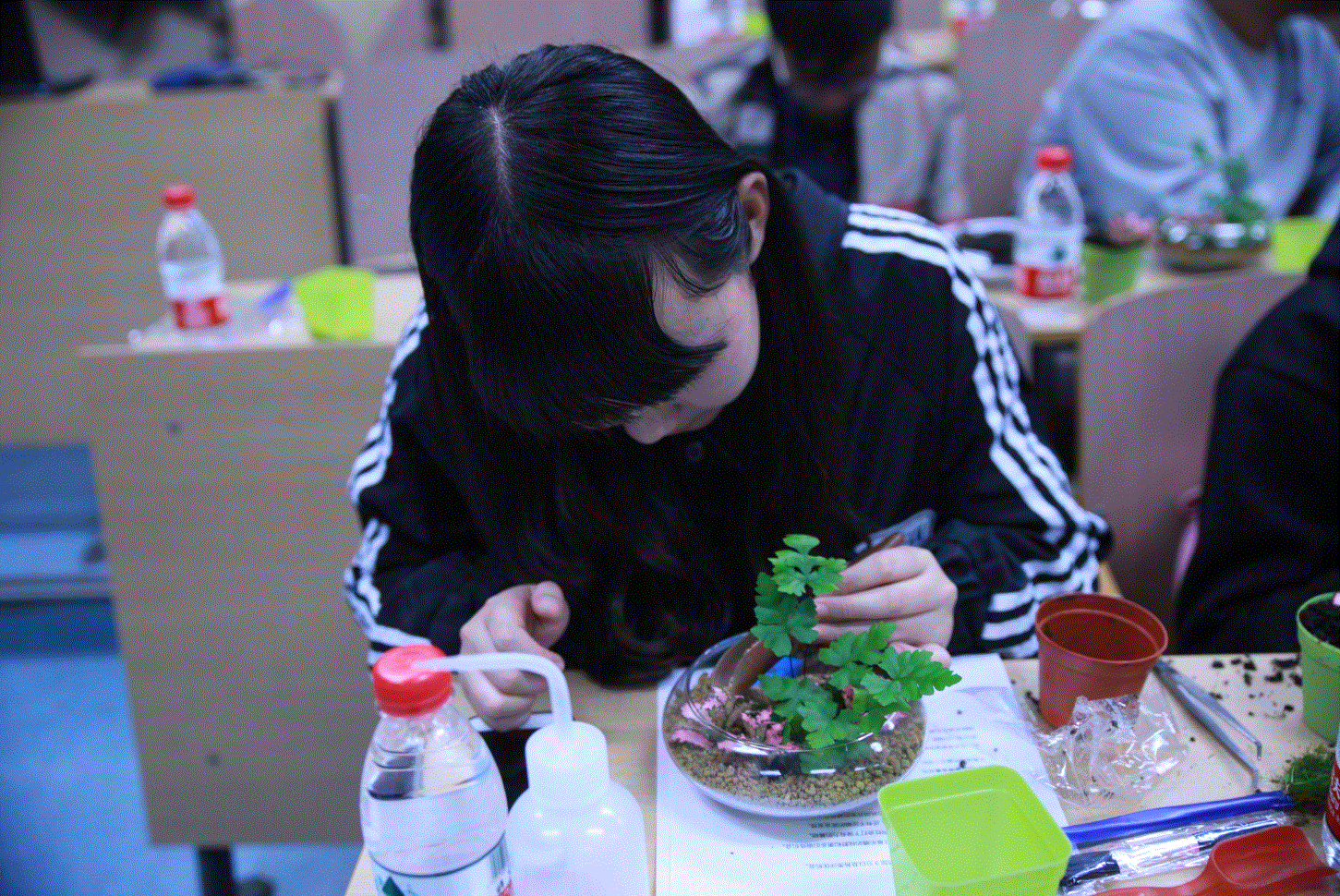 同学们认真制作多肉微景观