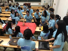 第二项进行的是“你画我猜”活动,活动中每个专业一组,自由组合,两人来猜,和小组其他成员面对面的站着,其他人只可以用手式做出动作,不准发出任何声音来提醒同组队员,对面的两人通过小组成员的表现猜词语。活动顺序通过抽签来决定,共三十个词语,在三分钟内猜对词语数量最多的小组获胜。