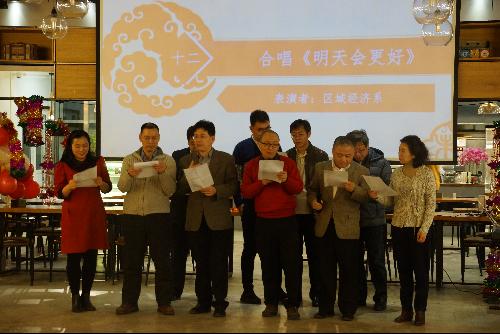 行政管理系老师们的《我爱你中国》快闪,拉开联欢表演的帷幕;十余位老、中、青教师联袂表演的舞蹈《映山红》让大家感受到了新春的临近,随着红色纱巾在手中飞舞,过年的红红火火欢天喜地浮现;土地资源管理系赵秀池老师为大家带来的原创脱口秀《汗水浇灌丰收年,城市学院胜从前》,让2019年学院的丰厚硕果历历在目,才情满满;刘文东携五位新人老师表演的《千年等一回之舞王再现》诙谐逗趣,给现场带来了很多欢乐;城市经济管理系表演的儿歌小合唱给大家带来了耳目一新的感觉,发出了希望城市学院快快发芽,快快长大的期许;新人代表,来自土地资源管理系的张灵老师和闺蜜一起带来的舞蹈《桥边姑娘》韵味十足,百看不厌;最后区域经济系老师们带来的歌曲《明天会更好》表达了积极迎接崭新曙光,用希望迎接更好的明天的愿景。