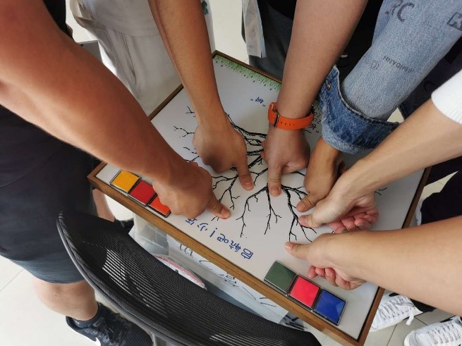 每个小组按照印制好的搜索点,自由选取路线,在校园内寻找手持印章的志愿者,正确回答精心设计的问题,盖取印章后再到下一个点进行搜索,直到完成所有搜索点。顺利回到终点后还需要完成一项终极任务,即所有新生用指纹和心愿卡共同绘制一副象征成长与智慧的“城长知树”。