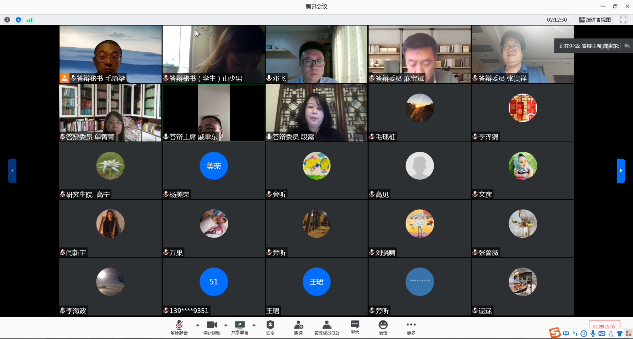 答辩全程采用腾讯会议、微信群、问卷星等多平台综合协调方式进行,由专人进行全程录屏,答辩秘书作纸质记录。答辩小组老师充分认可这种线上答辩方式,觉得与以往线下答辩会相比,效果毫不逊色。答辩学生也表示,网络答辩的形式,并不影响交流的畅通性,对于答辩人来说,可以坐在电脑前,随时在纸上记录问题,做一些标记,更有利于集中精力思考。总体而言,线上论文答辩虽然改变了形式,但答辩的质量要求并没有改变,做到了线上线下同等质量。