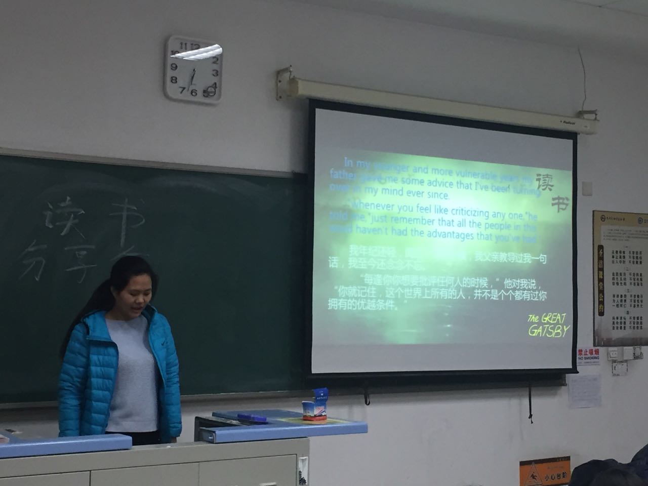 在座的同学们都深深地感受到了《曾国藩家书》的内在精神力量,提升起了对阅读的无限敬仰与崇敬。其他班的讲解中不乏分享《了不起的盖茨比》、《不能承受生命之轻》、《老人与海》、《傲慢与偏见》、《牧羊少年奇幻之旅》、《无人生还》以及《拾年》等这样文学性小说作品的,也不乏解析《蒙田随笔》、《人与永恒》、《查拉斯图拉如是说》、《理想国》等一类思想随笔著作的,更少不了分享,《史记》等研究性历史学术作品的,还有同学则更乐于分享一些如《365种改变世界的方法》、《你的80%的时间都用错了》、《高效能人士的七个习惯》等更具有实用性、更现代的书籍。“我们总喜欢给自己找很多理由去解释自己的懦弱,总是自欺欺人的去相信那些美丽的谎言,总是去掩饰自己内心的恐惧,总是去逃避自己犯下的罪行。但事实总是,有一天,我们不得不坦然面对那些罪恶,给自己心灵予救赎。” 公共管理1班,周树云同学与大家分享了《追风筝的人》中她最喜欢的经典名句。