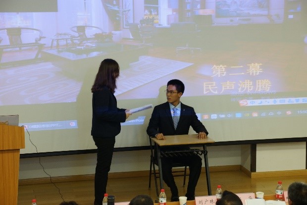 第九届全国高校“模拟市长”大赛首经贸校内赛主要分为三个环节。第一个环节是“锋芒初露”,九支队伍依次上台通过视频向评委及观众介绍团队成员及所研究的问题。第二个环节是“唇枪舌剑”,九支团队采用PPT展示、圆桌会议、情景模拟、视频等多种形式展示了团队的研究内容、过程和成果,并接受了评委们的现场提问。