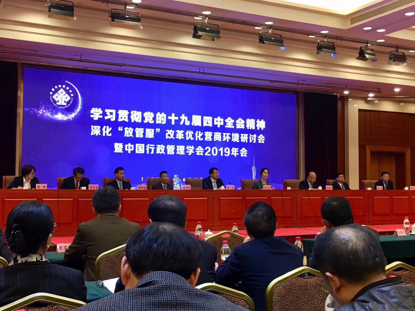 11月29日,“学习贯彻十九届四中全会精神深化‘放管服’改革优化营商环境”研讨会暨中国行政管理学会2019年会在广州市隆重召开。广东省人民政府副省长张虎,中国行政管理学会会长、全国人大常委、全国人大社会建设委员会副主任委员江小涓,中国行政管理学会原荣誉会长、行政管理学奠基人夏书章教授出席会议,来自学术界和实务部门的近三百名专家学者进行了研讨交流。AV视频 城市学院张国山院长带领行政管理系潘娜、王蕾、闫志刚三位教师参加了会议。