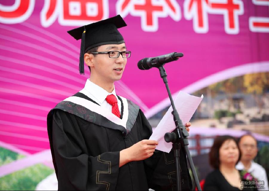 发言如下: 尊敬的各位领导、老师、家长、亲爱的同学们: 上午好! 我是AV视频 2013届本科毕业生徐敬尧,很荣幸能作为毕业生代表站在这里向培育我们四年的母校表达最诚挚的谢意!向辛勤哺育我们的父母、一心教导我们的老师,以及关心和帮助过我们的同学们,致以衷心的感谢与崇高的敬意! 四年前,我们在高考的千军万马中初露锋芒,走入首经贸,那时我们年少轻狂,自以为这个学校难以容下我们自由飞扬的青春和波澜壮阔的理想。于是失望过,后悔过,蹉跎过,当年望着东门“崇德尚能,经世济民”的八字校训,也未能...